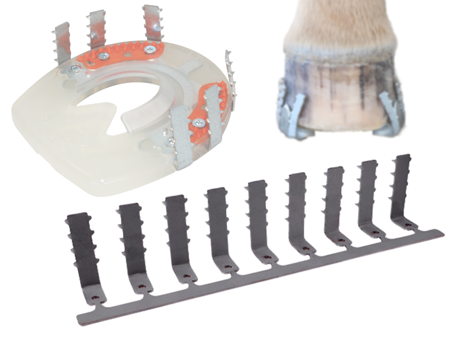 Our cast hooks can be used in combination with every composite horseshoe of our range. We do not recommend using them with the pure plastic shoes. Our open-toed horseshoes have proven their worth in various diagnoses in combination with our cast hooks. Unfortunately, when using the regular horseshoes, manual adjustments to the cast-hooks are still necessary from size 142mm onwards.